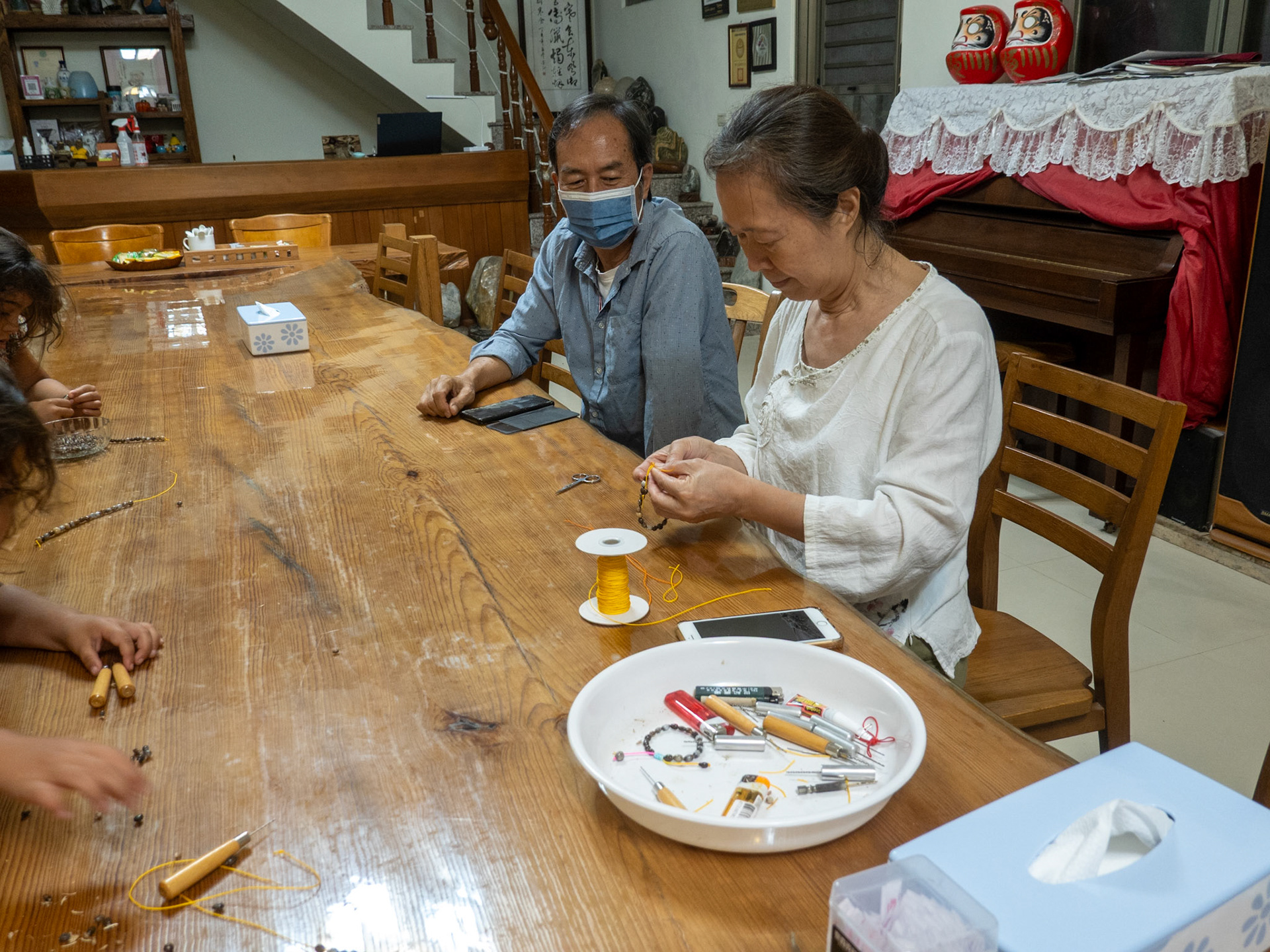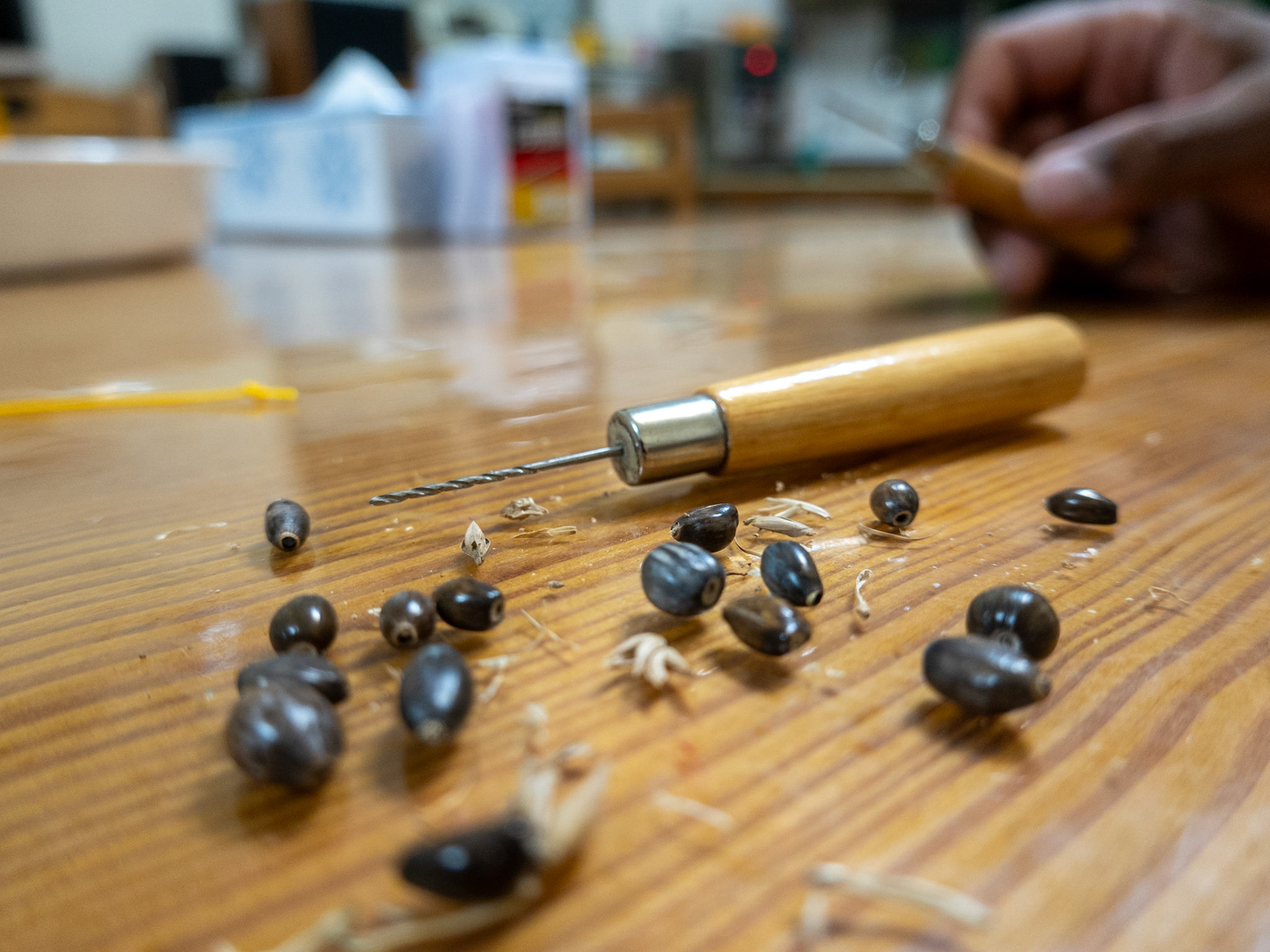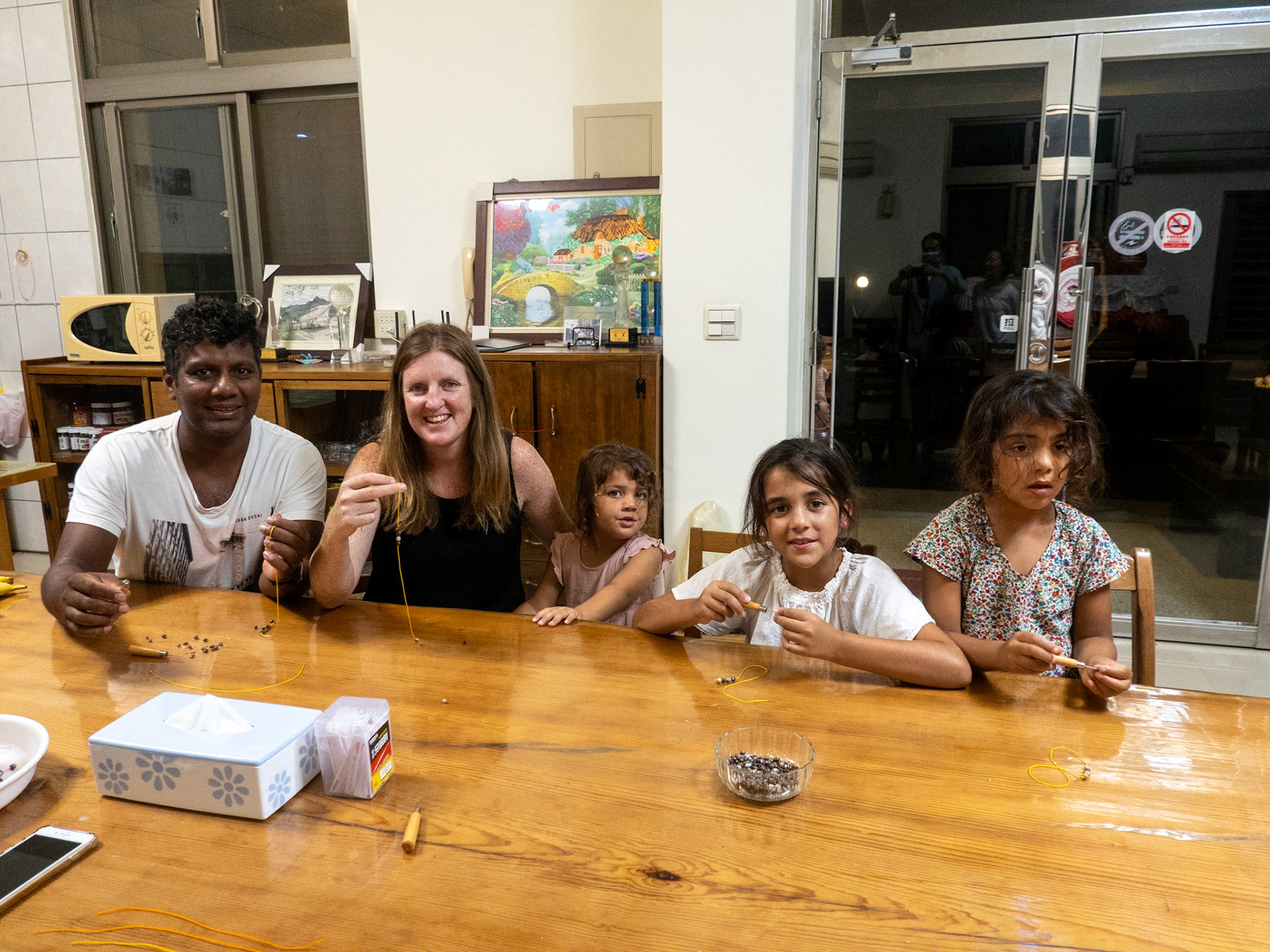 Learning how to make bracelets from the dried seeds of a local plant.