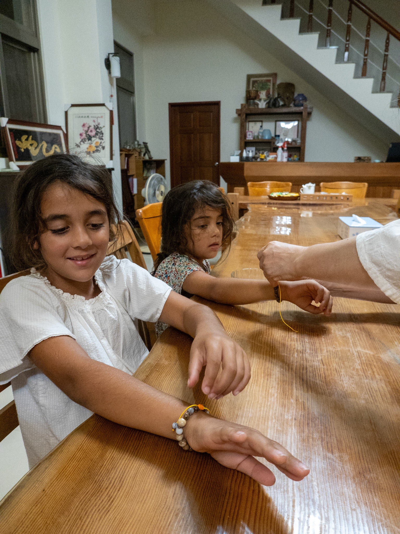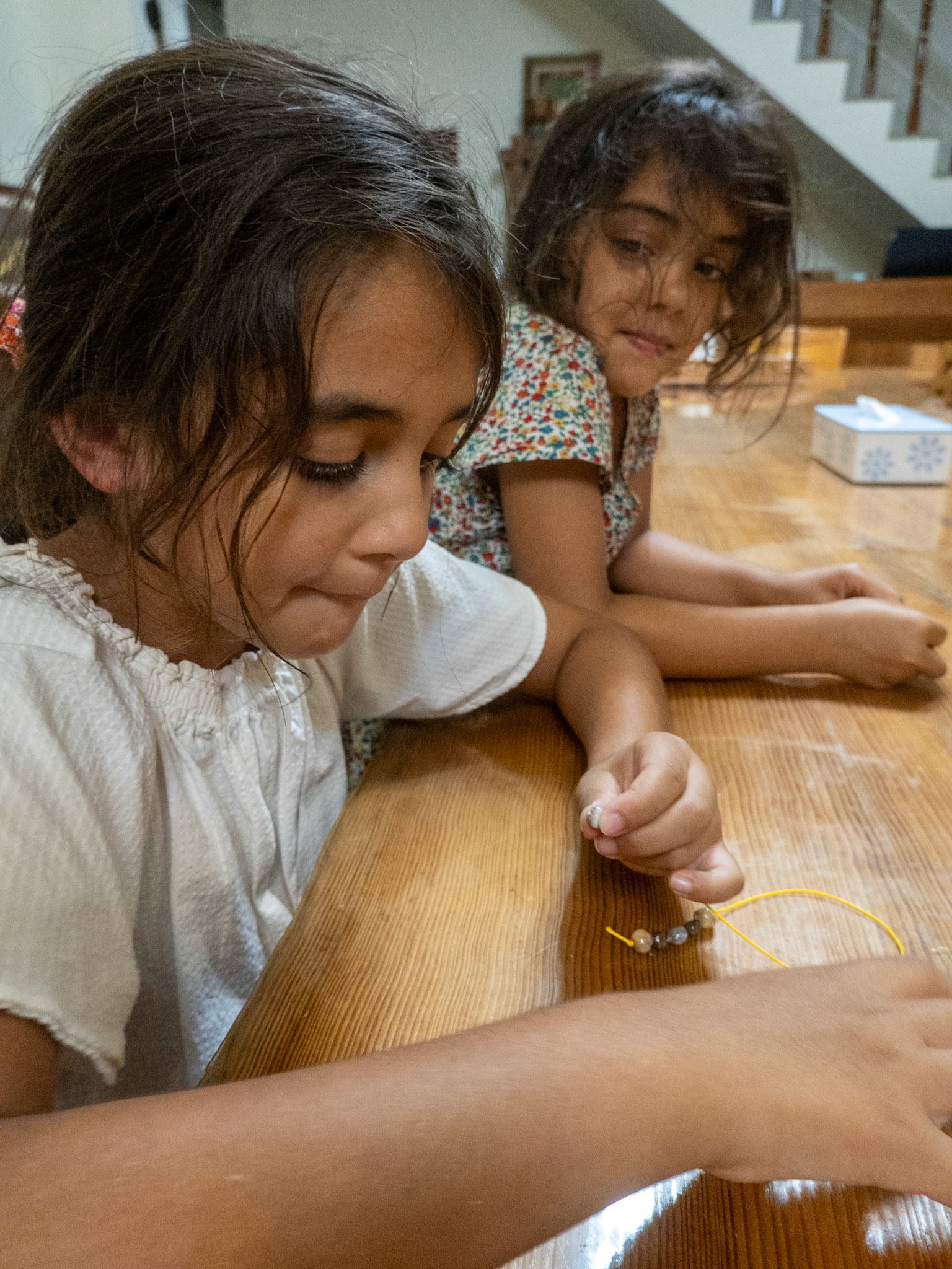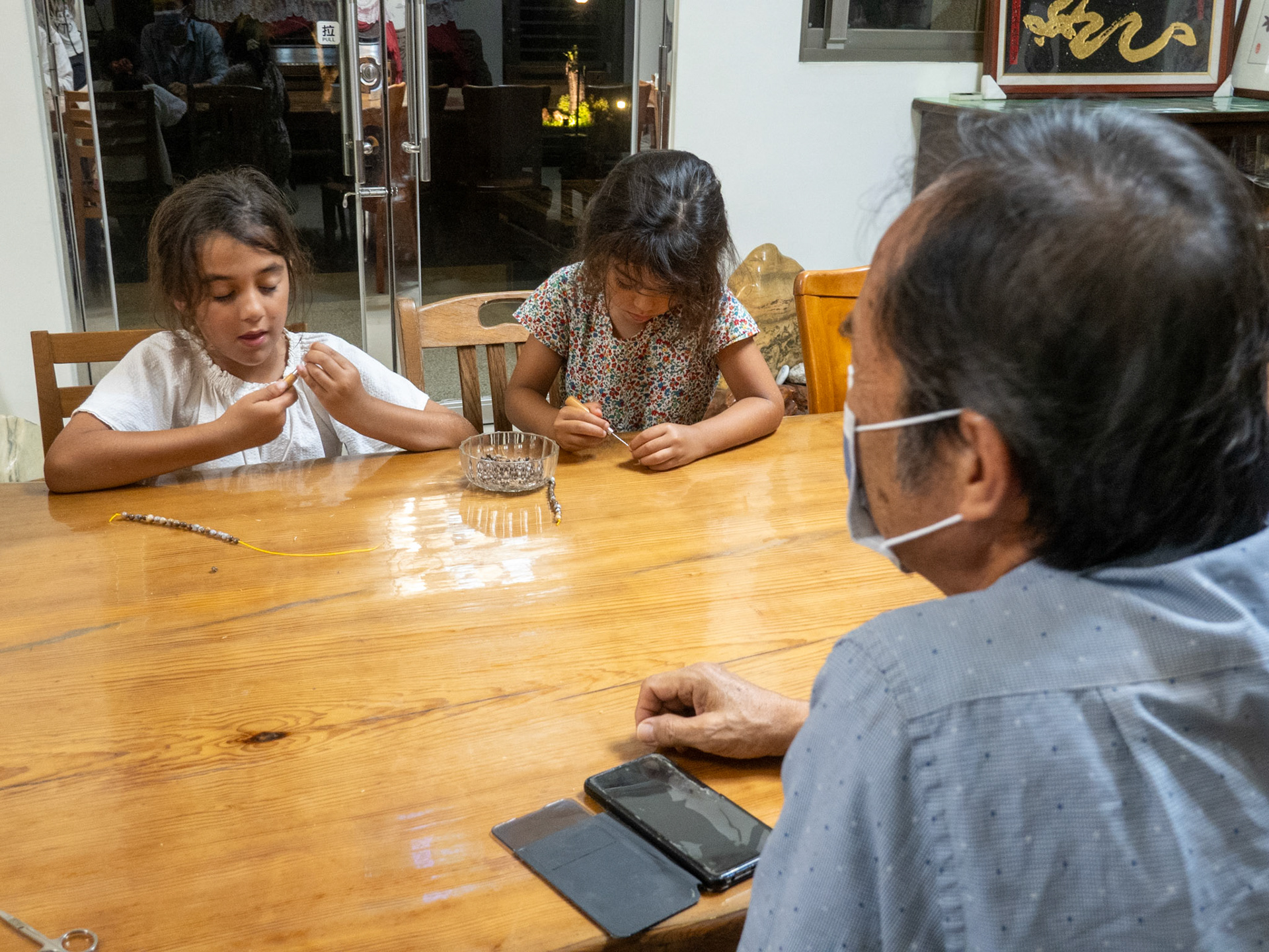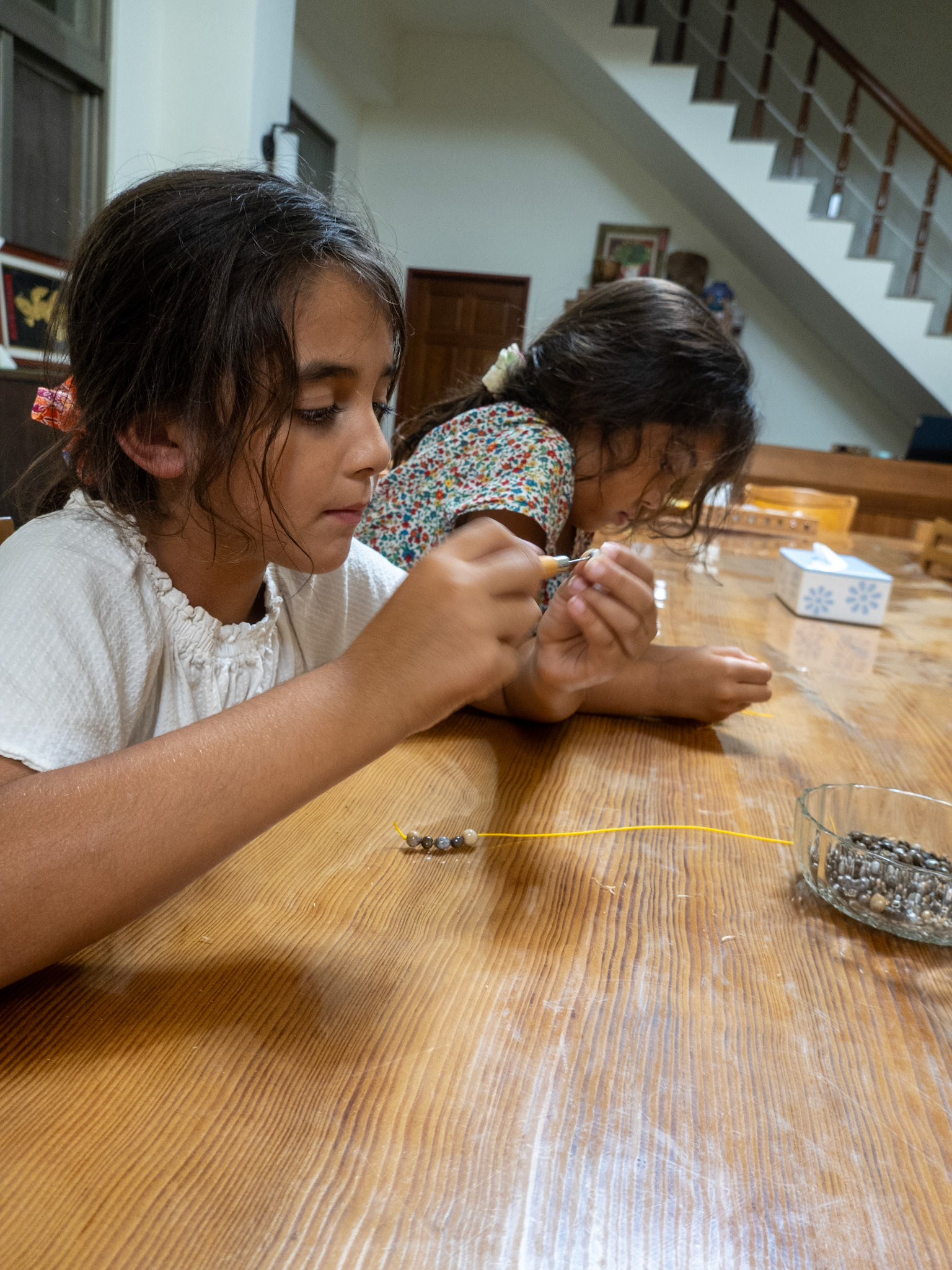 Learning how to make bracelets from the dried seeds of a local plant.